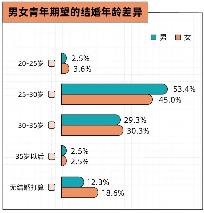 婚龄方面,5成人心目中,25-30岁是最佳结婚年龄,3成人选择30-35岁,仅有不到3%人选择在20-25岁成家。