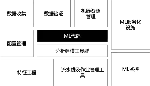 2015年,谷歌发布的论文指出,为了避免无休止的“技术债”缠身,应该强调将ML生产化视为一门学科的重要性(在当前的ML技术主流中确实如此),通过加强工程技术的投入来顺利实现ML的生产化。如图1所示,ML模型的生产化是由多个模块组成的,在实际场景中需要在这些模块间建立沟通机制来配合完成ML模型的生产化。