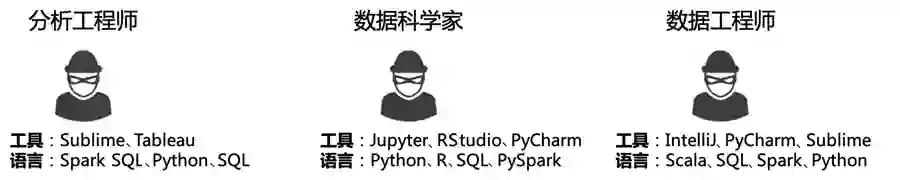 当然,不同的角色可能会使用不同的工具或编程语言,没有一个工具可以涵盖所有任务,更重要的是,单个任务通常需要多个角色和多个工具来协作实现。以分析工程师、数据科学家和数据工程师为例,如图2所示,数据工程师可能会使用IntelliJ中的Scala创建包含数亿个事件的数据集的聚合,分析工程师可能会在相关业务的分析报告中使用SQL和Tableau对该聚合进行分析和可视化,而数据科学家可能会使用Python处理该聚合并参考分析工程师的分析结果进行线上营销模型的构建。