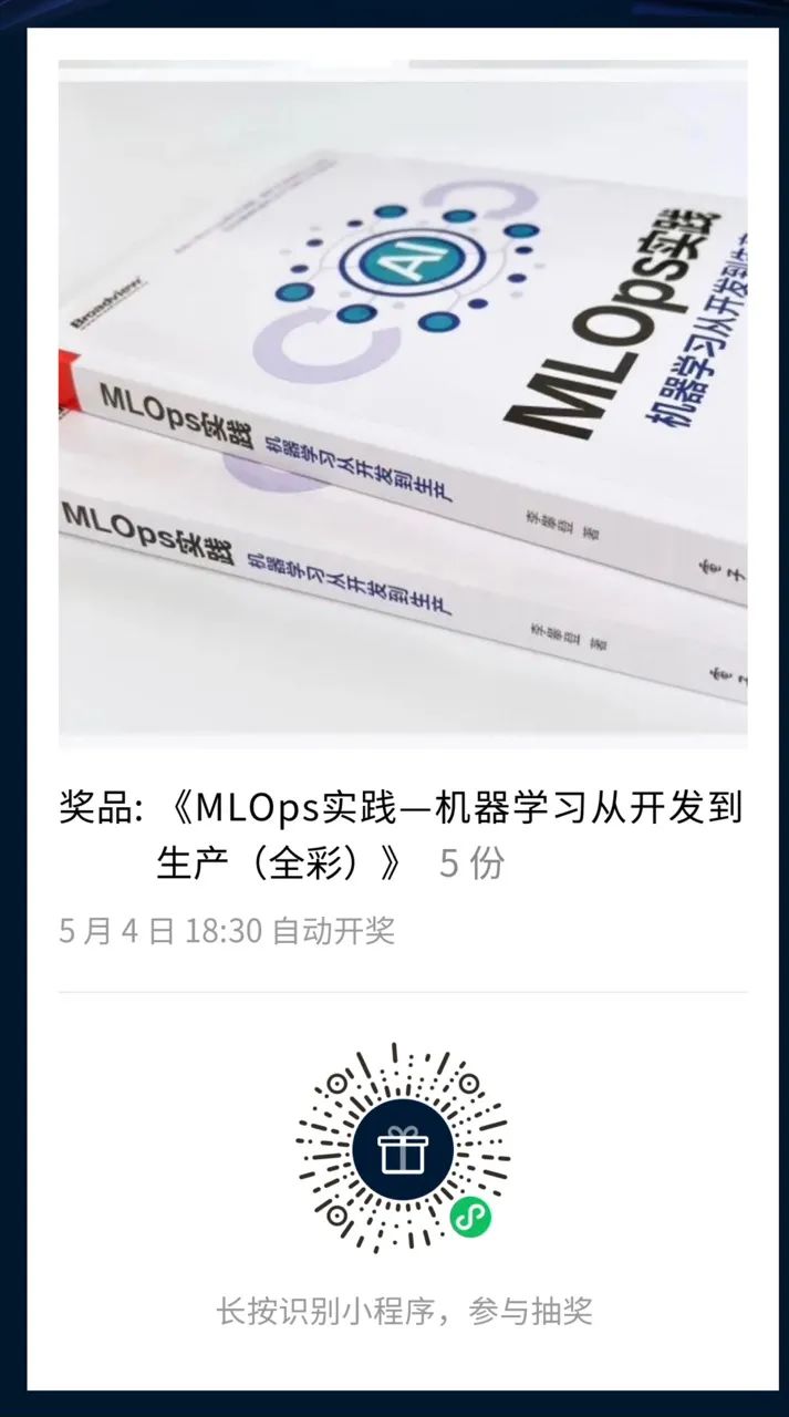 AI 前线为粉丝准备了《MLOps实践――机器学习从开发到生产(全彩)》纸质书籍 5 本!长按识别下图小程序,参与抽奖活动,由小程序随机抽出 5 位,每人赠送一本书。开奖时间:5 月 4 日(下周三) 18:30,获奖者每人获得一本。
