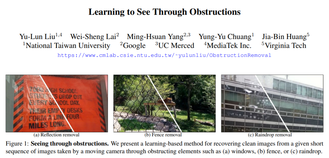 我们提出了一种基于学习的方法来去除不需要的障碍物,如从一个移动的相机捕获的短序列图像中的窗户反射、栅栏遮挡或雨滴。我们的方法利用背景和障碍物元素之间的运动差异来恢复这两个图层。具体来说,我们在估计两层的密集光流场和通过深度卷积神经网络从流扭曲图像重建每一层之间进行交替。基于学习的层重构允许我们在流量估计和脆性假设(如亮度一致性)中考虑潜在的误差。结果表明,综合生成的训练数据能很好地转换为真实图像。我们在反射和栅栏移除的许多挑战性场景中的结果证明了该方法的有效性。