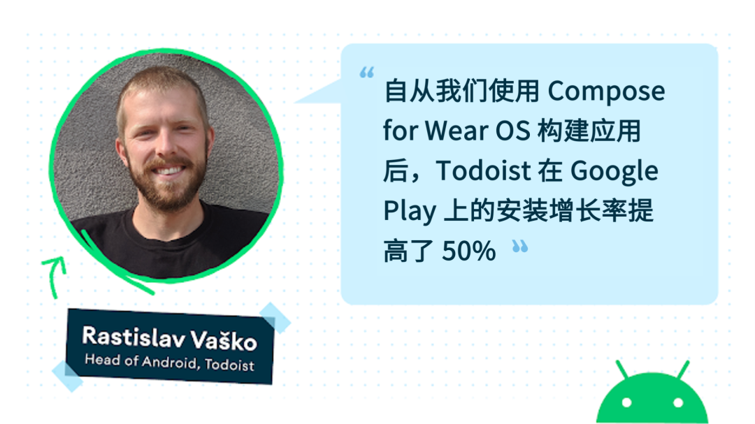 Todoist 的开发者已使用过 Android 移动版 Jetpack Compose,因此他们很快便能熟练使用 Compose for Wear OS。Todoist 的 Android 部门主管 Rastislav Vaško 说,"当新的 Wear 设计语言和 Compose for Wear OS 发布时,我们非常兴奋。这为我们带来了新的动力,也带来了未来在平台投入资源的机会。"
