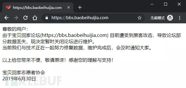 2019年6月30日,一个名为“宝贝回家”的民间志愿者寻子公益网站的官方论坛(https://bbs.baobeihuijia.com)无法正常访问。官方公告称,遭受黑客攻击导致部分数据丢失,目前仍然在闭站维护中。