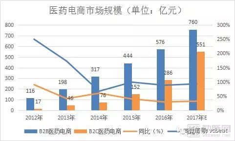 其中B2B业务销售额576亿元,B2C业务销售额36亿元。另据Choice数据,2016年B2C医药电商规模为286亿元。