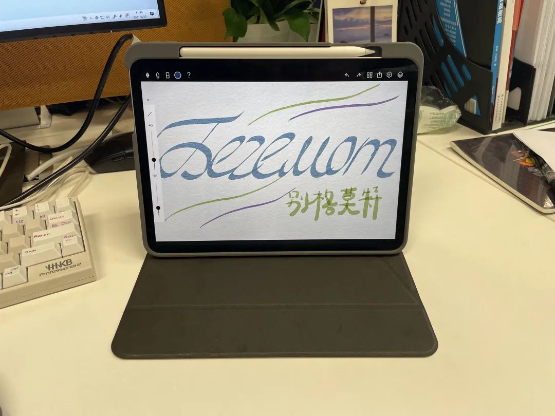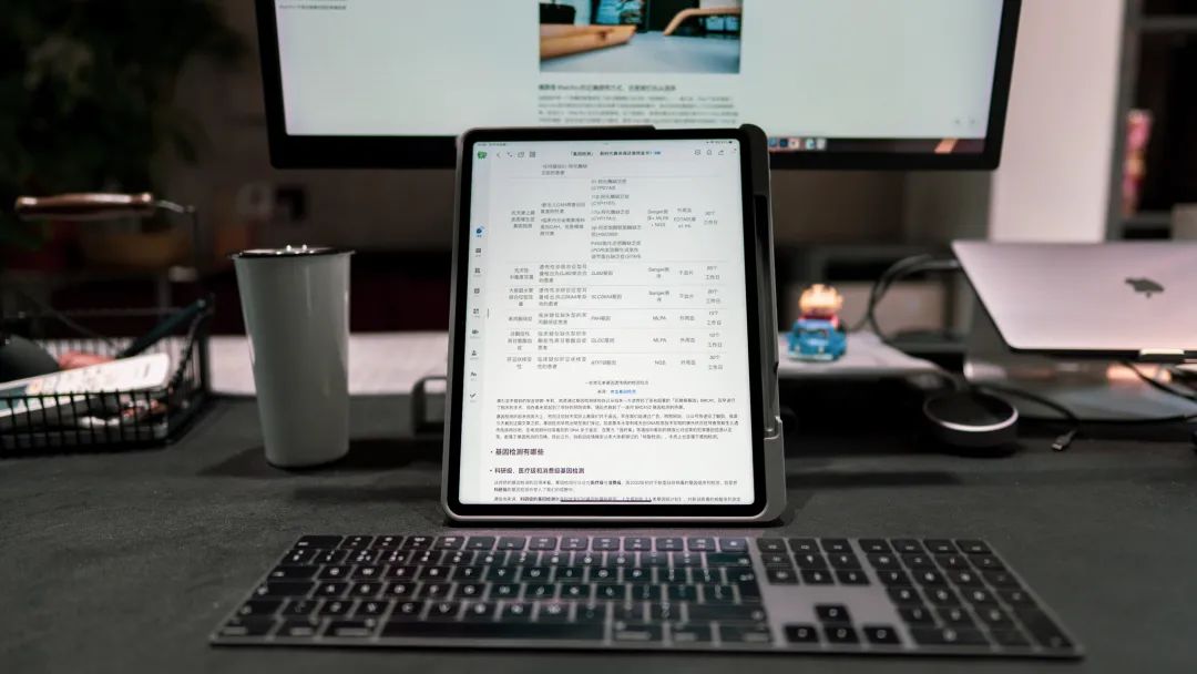 这款保护壳一个有趣的新意是花了很大篇幅推介自己的「竖屏模式」。一直以来,iPad 产品系里除了iPad mini 因为更适合手持所以更多场景下我是竖屏使用以外,其它系列好像就默认了它应该是横屏使用,而当介入「iPad Pro 也可以竖屏使用」这个视角时,发现好像过去只是因为更大尺寸 iPad 竖屏持握不利于操控,而无论官方还是第三方配件,甚至 iPad 适配 App 的设计都在潜移默化影响我们「iPad 就应该是横着用,如果你想竖着那是你做作」的斯德哥尔摩。很多人对竖屏模式的需求主要在于抖音等竖版视频,但因为我比较抗拒这类产品,所以想主要讲讲「第二块屏幕」。我记得不久前我们在首页推荐来自果核的《iPad 使用指南 2021》时,里面有一段争议比较大但我很认同的描述:我们都知道 iPadOS 本身是由 iPhone 的 iOS 演化而来。所以它本身的风格延续了触控的沙盒机制。最简单的说法就是,它本身是由一个个 App 为核心组成的生态。因此某种意义上来说,我们能否进行什么样的工作,能够多快进行工作,都是由某一个 App 决定的。这样的沙盒机制有好有坏,坏处就是它缺乏应用之间的联动,使用起来并不自由,但是好处就是它可以让你更加专注,不受打扰。即便不谈 iPad Pro 这个产品,我 MacBook Pro 外接的是一块 27 英寸显示器,当我想要正儿八经写稿等需要专注的工作时,我通常会把当前窗口全屏;而用上这个保护壳的竖屏模式后,无论是借助 macOS 与 iPadOS 之间通信的随航模式还是在 iPad Pro 上单独打开文档应用,它都成了一小块离我更近,也更让我专注的「第二屏幕」。这只是可使用的场景之一,除了编辑文稿,我也常用来浏览文档或者利用它这块更优秀的屏幕在修图时用于预览。如果说横屏是为了呈现更多内容,我认为竖屏则是力图聚焦,所以如果你依旧习惯使用电脑工作,这不一定是因为你没有用好 iPad Pro,不妨试试让它成为你保持专注的助力之一,并通过竖屏模式呈现。