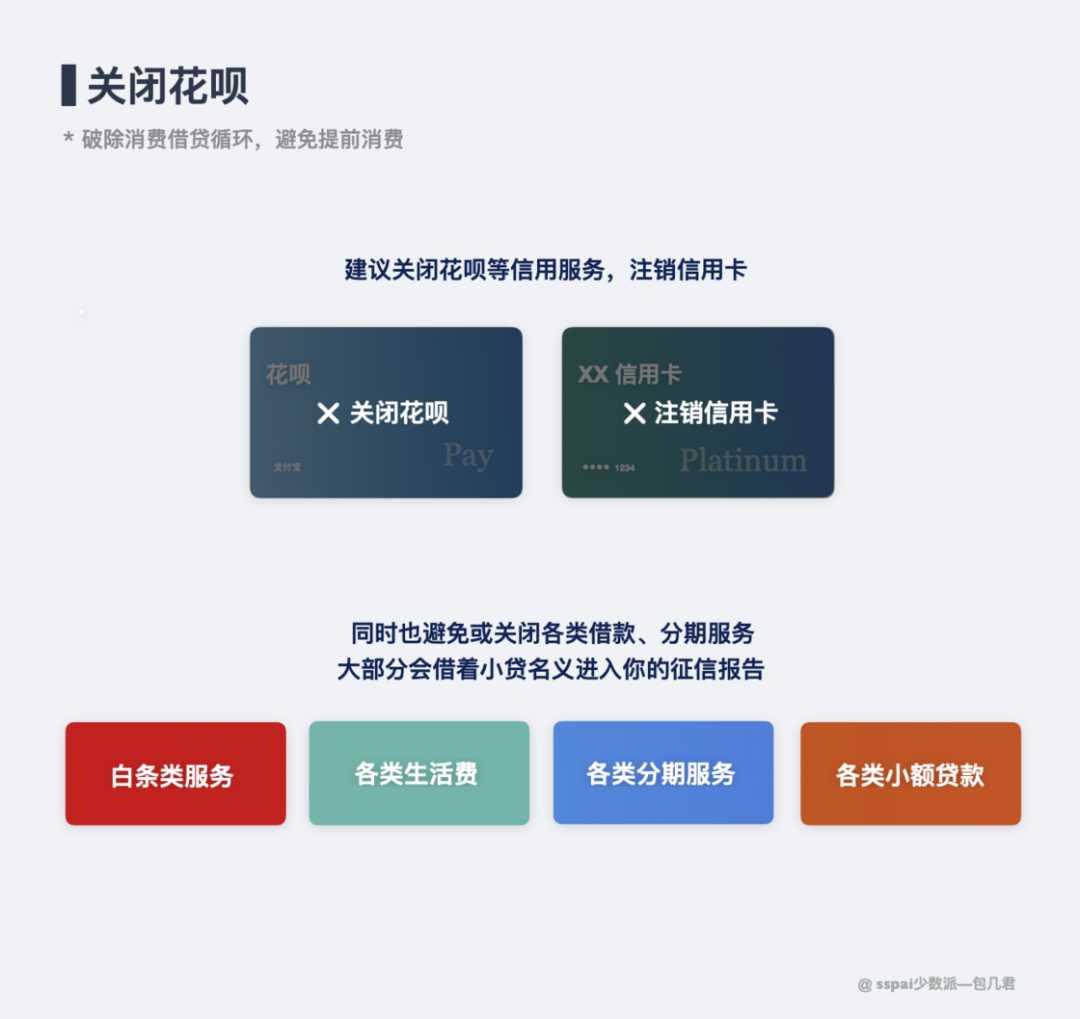 要破除这个循环,只能砍断链路的其中一部分。躲避广告不是一件容易的事,但是否还要提前消费,这却是你说了算。你需要下定决心,把花呗、信用卡里所有的欠款补上。不要想着下个月,如果认为自己无法驾驭这些借贷产品,那么最好的方法是应该立刻关掉它们。