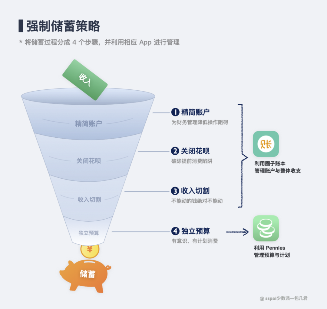 所以在当前这个阶段,在如何与金钱相处的这件事上,自己又回到如何强制储蓄,如何积累本金的问题上。目前以个人经验,将整个储蓄过程分成 4 个步骤,每一个步骤都旨在缩小财富的出水口。