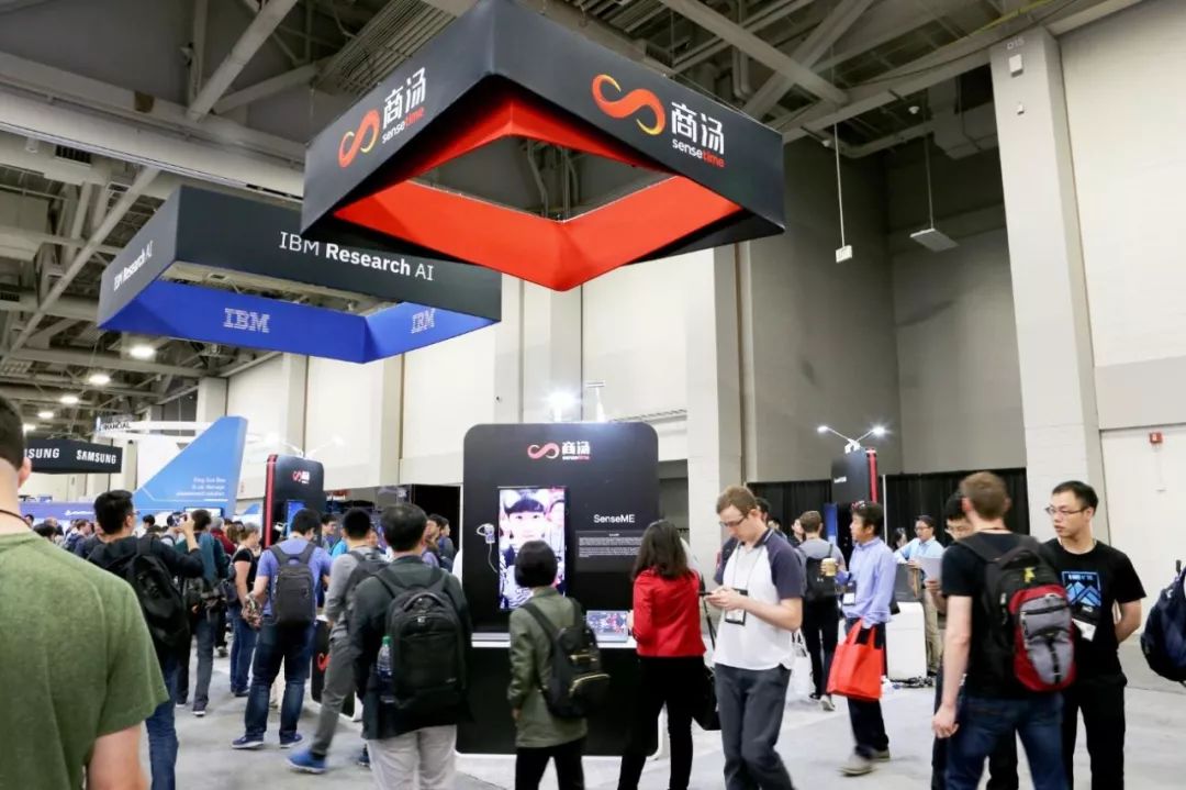 在那会儿,商汤的展台布置还比较简单:两边各摆上一张海报,中间摆着三台屏幕展示Demo,后面摆着几张桌子。