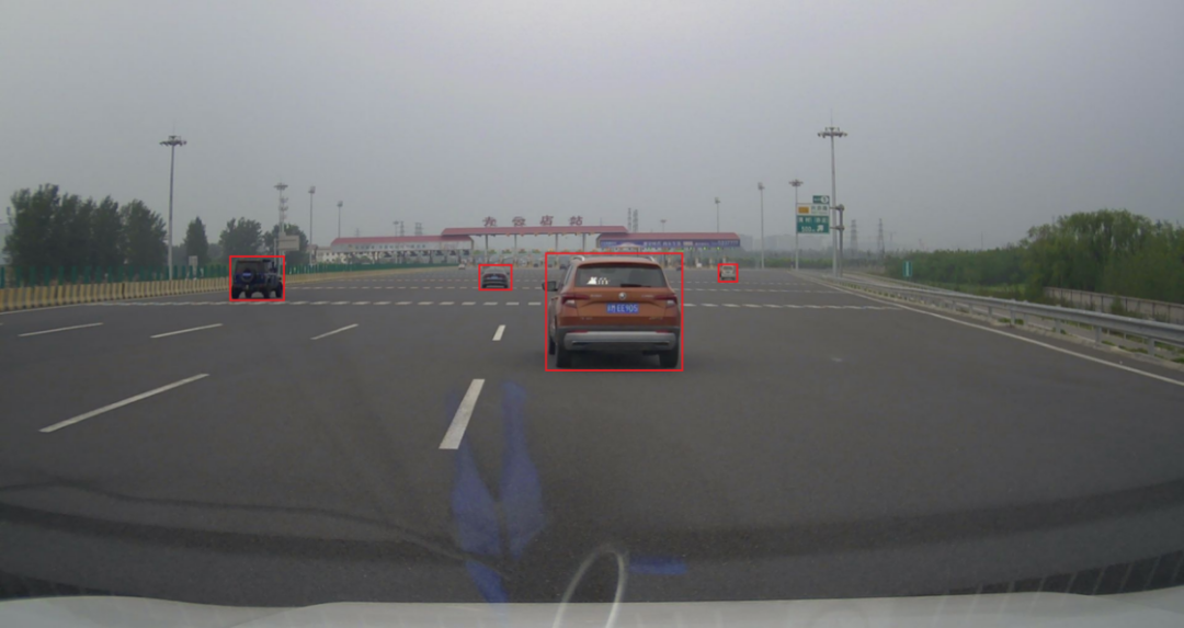 在高速公路上,自车或邻车变道场景下,检测图像中的多个车辆目标,并实现稳定跟踪。需要输出车辆目标的二维框和ID,其中同一场景(连续帧)下的同一辆车的ID应保持一致。