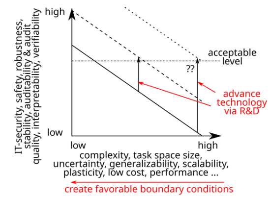 图 5:在尝试达到可接受的 IT 安全性、审计质量、鲁棒性和可验证性水平时必须考虑的多方面权衡。可实现的水平取决于多个边界条件,例如任务复杂性和模型复杂性。对于给定的边界条件,通过研发的技术进步可能允许例如实现更高的 IT 安全级别和/或改进的可审计性,但到目前为止,这仅在有限的范围内起作用。