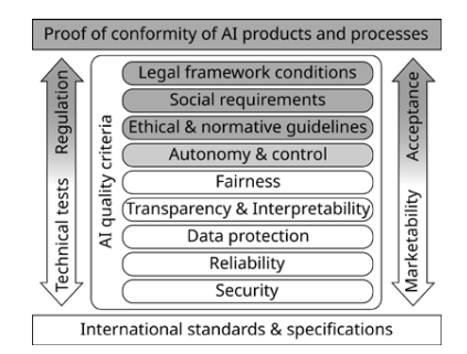 关于本白皮书中讨论的测试和审计人工智能系统的主题,出现了哪些人工智能质量标准需要独立测试以及需要为此类测试程序本身开发哪些标准的问题。为了解决这种缺乏标准的问题,例如,在德国,以“Normungsroadmap KI”[99] 的形式提出了对人工智能领域现状以及对标准和规范的需求的综合分析。应该通过标准化解决的最重要的质量维度如图 3 所示。