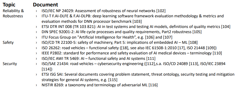 表 1:本白皮书涵盖的选定主题的人工智能领域的新兴标准。有关更完整的概述,请参阅[99] 和 [117]。