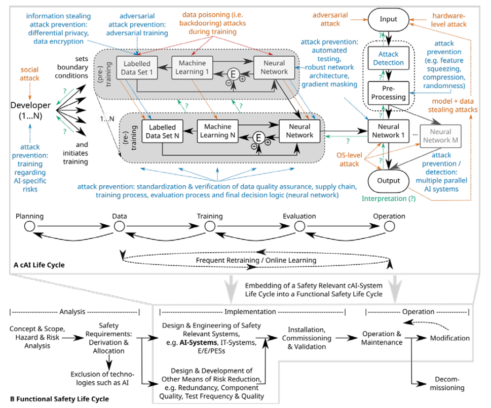 图 2:A) 连接主义 AI (cAI) 系统的广义生命周期示意图,强调了对 AI 系统进行彻底审计时必须考虑许多方面。在这里,生命周期是从 IT 安全角度来看的,包括漏洞(红色)、防御(蓝色)和解释(绿色 + “?”)。有监督的再训练或在线学习可以选择性地与运营并行,并在运营期间连续运行,从而导致评估应该何时以及多久进行一次评估的问题。评估、验证、确认和标准化应考虑整个生命周期。B) 一个 cAI 生命周期 (cAILC) 可以是例如嵌入到功能安全生命周期中(fSLC,参见例如 [17; 18])。后者可能包含几个与安全相关的系统,例如还包括 sAI 和 cIT 系统(参见图 1),包括在开发阶段和最终退役阶段之前的广泛分析阶段。请注意,cAILC 和 fSLC 通常都是高度迭代的。