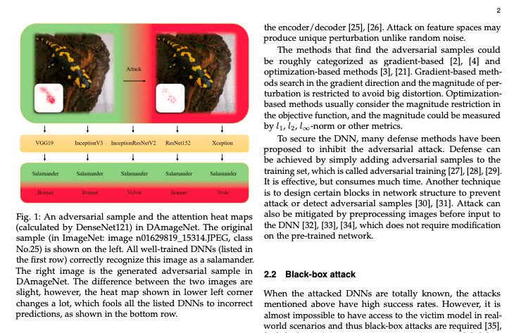 这篇论文研究的是深度神经网络的对抗性攻击。这篇论文提出了注意力集中攻击(Attack on Attention, AoA),这是很多深度神经网络目前会采用的。在不超过10次决策查询的情况下,AoA可以对很多常用的深度神经网络达到接近100%的成功率。这篇论文应用AoA在ImageNet上生成了96020个对抗样本,并且将这些样本组成的数据集命名为DAmageNet。在这个数据集上,这篇论文测试了20个深度神经网络,当它们没有对抗训练时,错误率都超过90%。通过DAmageNet这个数据集的提出,可以为未来的深度神经网络的鲁棒性研究提供一个新的基准。
