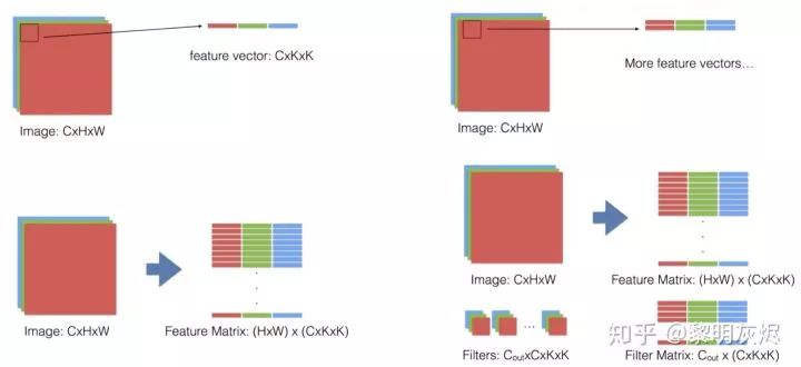 im2col 是计算机视觉领域中将图片的不同通道(channel)转换成矩阵的列(column)的计算过程。Caffe 在计算卷积时,首先用 im2col 将输入的三维数据转换成二维矩阵,使得卷积计算可表示成两个二维矩阵相乘,从而充分利用已经优化好的 GEMM 库来为各个平台加速卷积计算。