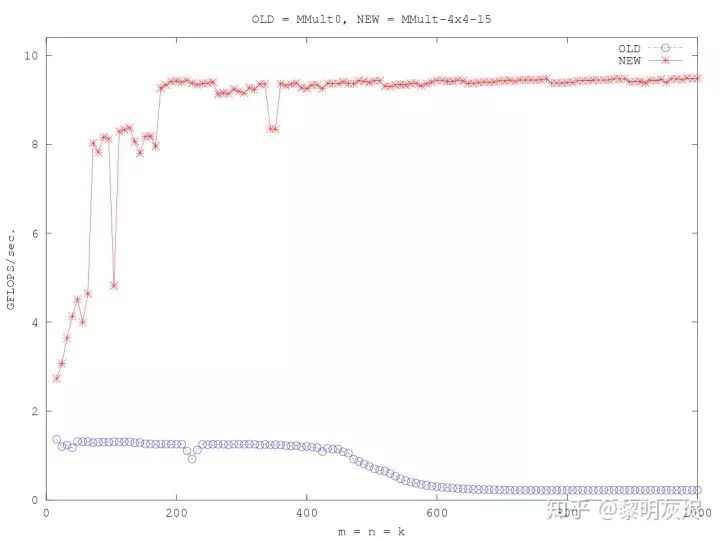 How to optimize gemm (https://github.com/flame/how-to-optimize-gemm/wiki)介绍了如何采用各种优化方法,将最基础的计算改进了约七倍(如图二)。其基本方法是将输出划分为若干个 4×4子块,以提高对输入数据的重用。同时大量使用寄存器,减少访存;向量化访存和计算;消除指针计算;重新组织内存以地址连续等。详细的可以参考原文。