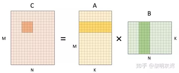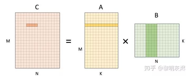 通用矩阵乘(下文简称 GEMM)的一般形式是 𝐶=𝐴𝐵C=AB, 其中 𝐴A 和 𝐵B 涵盖了各自转置的含义。图一是矩阵乘计算中为计算一个输出点所要使用的输入数据。三个矩阵的形状也如图所示。