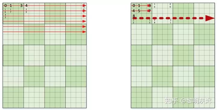 图七展示的是不同内存组织方式对的影响。图中两者都是行优先的内存排列,区别在于左侧小方块内部是不连续的,右侧小方块内部是连续的。图中用几个数字标记了各个元素在整个内存中的编号。