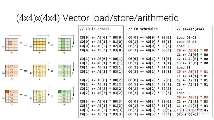 图六右侧列出了三份伪代码。第一份 C0 in detail 是计算 C0 中四个输出元素的朴素方法的展开,连续四次计算得到一个 C0 元素的结果。将计算过程稍作重排,即可得到 C0 scheduled 展示的计算,这里连续的四次计算分别处理了 C0 中四个元素的 1/4 结果。在连续的四次计算中,重排前只有对 𝐴A 的访存是连续的,重排后 𝐵 和 𝐶 的访存都是连续的。那么向量化这些访存和计算,即可得到第三列伪代码中红色 C0 部分。而第三列是通过对 C1、C2、C3 进行类似的处理得到的。