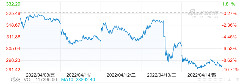 从近5日股票波动图可知,新思科技股票近乎一直在下跌,昨日已跌至近期最低点293.58。