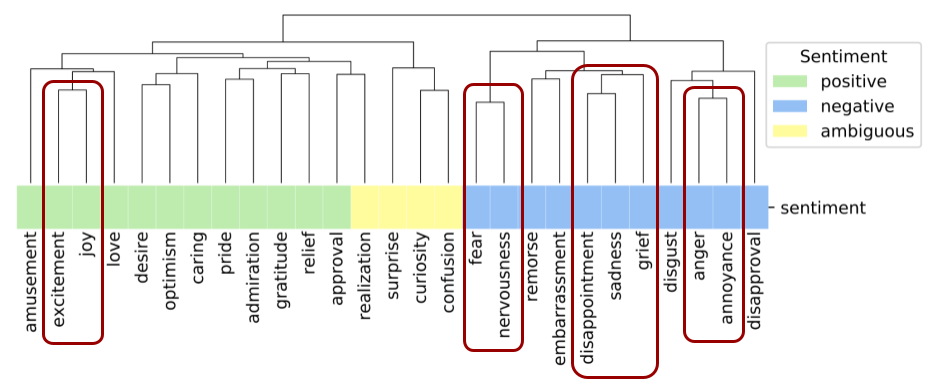 我们根据测评者判断结果之间的相关性来研究所定义的情绪集群。通过这种方法,当两种情绪经常被测评者共同选择时,它们会进入一个集群。我们发现,尽管在我们的分类系统中没有预先规定的情绪概念,但在情感方面有关联的情绪(消极、积极和模糊)会进入一个集群,这表明了测评的质量和一致性。例如,如果一个测评者选择“兴奋”作为给定评论的标签,那么另一个测评者就更有可能选择一种相关的情感,例如“快乐”,而不是“恐惧”。也许出乎意料的是,所有模糊的情绪都聚集在一起,而且它们与积极情绪的联系更为紧密。