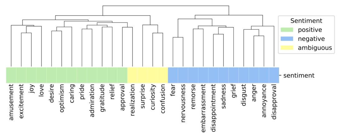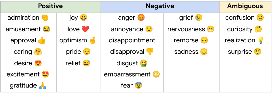 已公布的 GoEmotions 数据集包括下图展示的分类系统。经最后一轮数据标记,数据已全面收集完毕,其中分类和测评标准都是预先定义和固定的。
