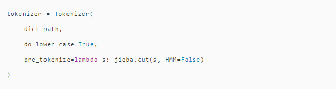 其中pre_tokenize为外部传入的分词函数,如果不传入则默认为None。简单起见,WoBERT使用了结巴分词,删除了BERT自带词表的冗余部分(比如带##的中文词),然后加入了20000个额外的中文词(结巴分词自带的词表词频最高的两万个),最终WoBERT的vocab.txt规模是33586。