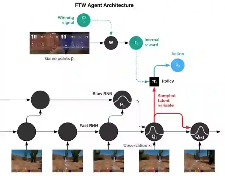 「为了胜利」(FTW)智能体的架构示意图。该智能体融合了快速和慢速两种时标的循环神经网络(RNN),包括一个共享的内存模块,并且学习了从游戏点到内部奖励的转换。