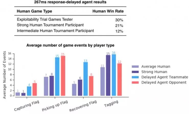 人类玩家在反应延迟的智能体面前,其胜率也很低,这说明即使反应延迟的时间与人类相当,智能体也比人类玩家表现好。除此之外,通过观察人类玩家和反应延迟的智能体的玩游戏情况,我们可以看到二者发生攻击事件的数目相当,说明这些智能体在这个方面与人类相比并不具有优势。