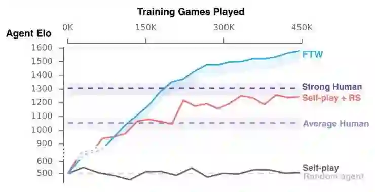 FTW 智能体通过学习变得比强基线方法强大得多,并且超过了人类玩家的胜率。事实上,在一份针对游戏参与者的调查中,它们比人类参与者表现出了更高的协作性。