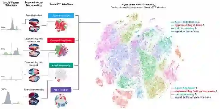 为了理解智能体如何表示游戏状态,我们对智能体神经网络的激活模式进行了研究,并且将其绘制在一个平面上。在下图中,一群群的点代表在游戏中的各种情景,相邻的点则代表相似的激活模式。我们根据高水平的 CTF 游戏状态来对这些点进行着色,这些状态包括:智能体在哪个房间中?旗帜的状态如何?可以看到哪些队友和对手?我们观察到的颜色相同的点簇,这代表的是智能体以相似的方式表示相似的高水平游戏状态。