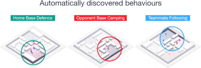 通过强化学习和种群水平的演进,这些行为逐渐出现在训练过程中。而随着智能体学会通过更加复杂的方式进行协作,就会逐渐淘汰掉像跟随队友这样的简单行为。