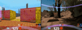 玩CTF游戏的智能体,以其中一个红色玩家为第一人称视角展现的室内环境(左图)和室外环境(右图)。