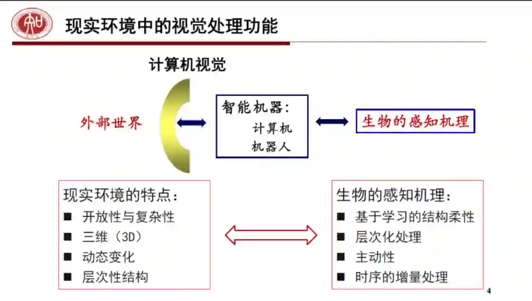 第一个部分是要通过视觉这个接口来同外部世界建立联系,同环境进行互动;第二个是我们讲视觉的时候,生物的感知机理给我们提供了很多依据。