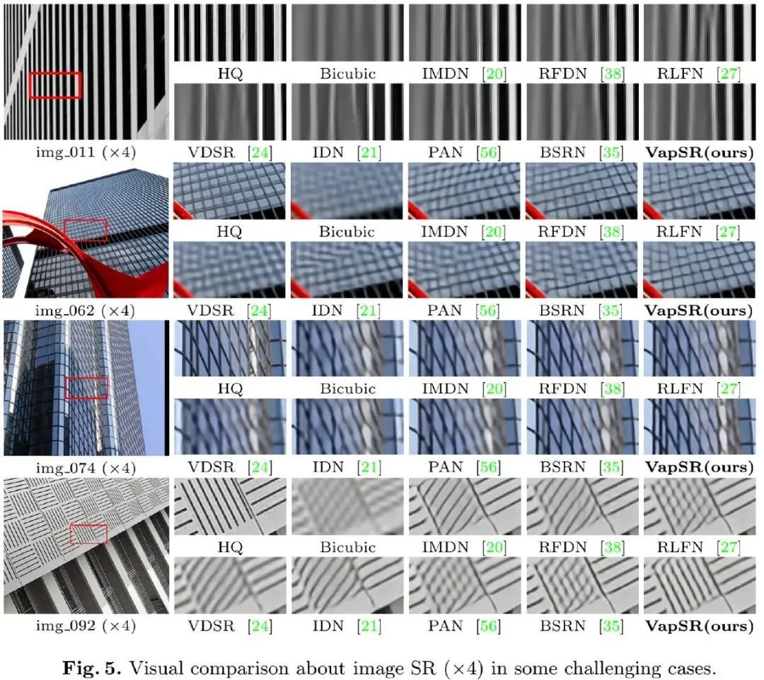 实验结果表明:相比其他轻量超分网络,VapSR具有更少的参数量。比如,项目IMDB与RFDN,VapSR仅需21.68%、28.18%的参数即可取得与之相当的性能。