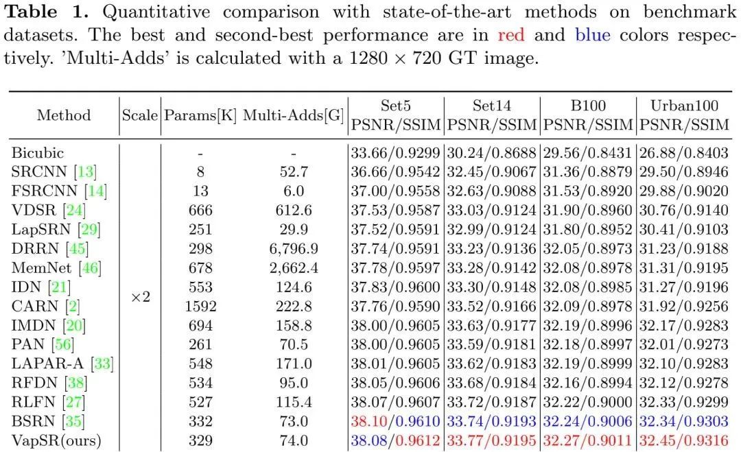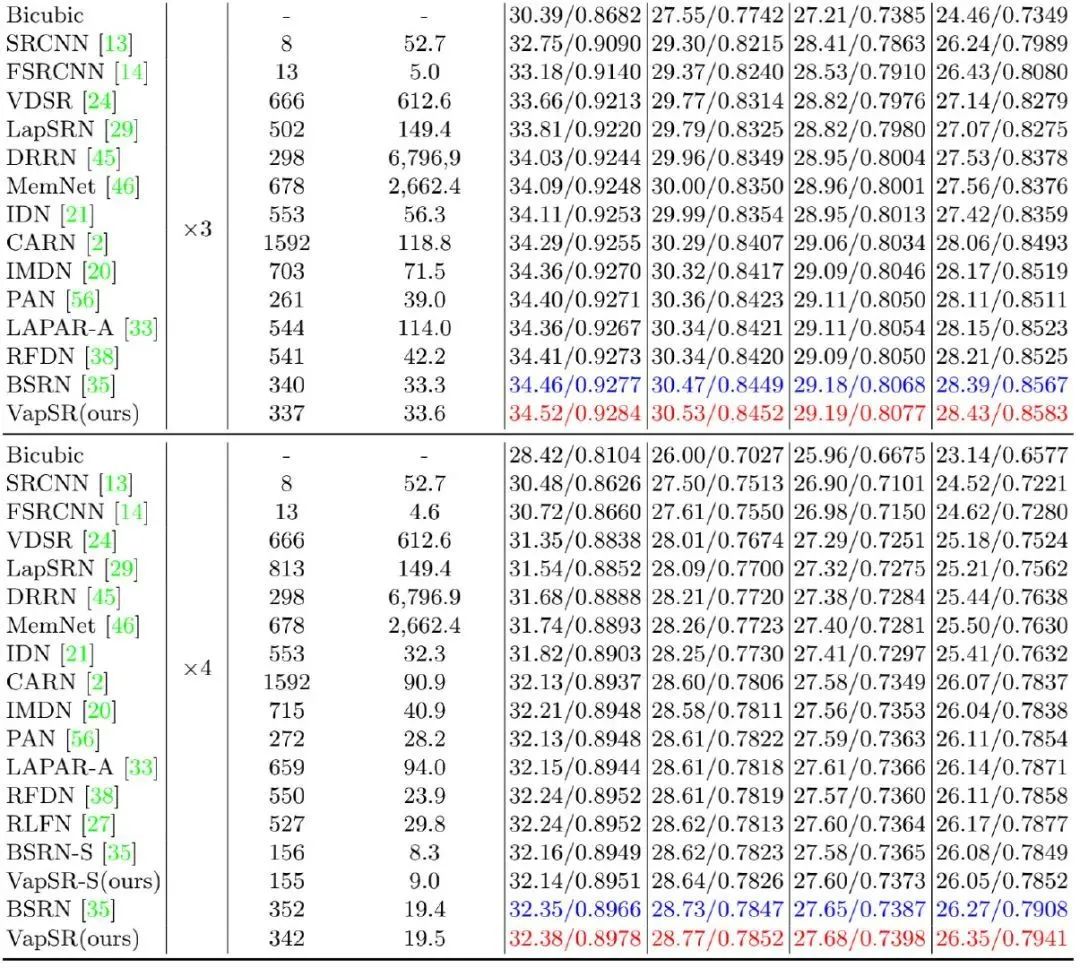 在实验部分,作者构建了VapSR与VapSR-S两个版本的轻量型超分方案: