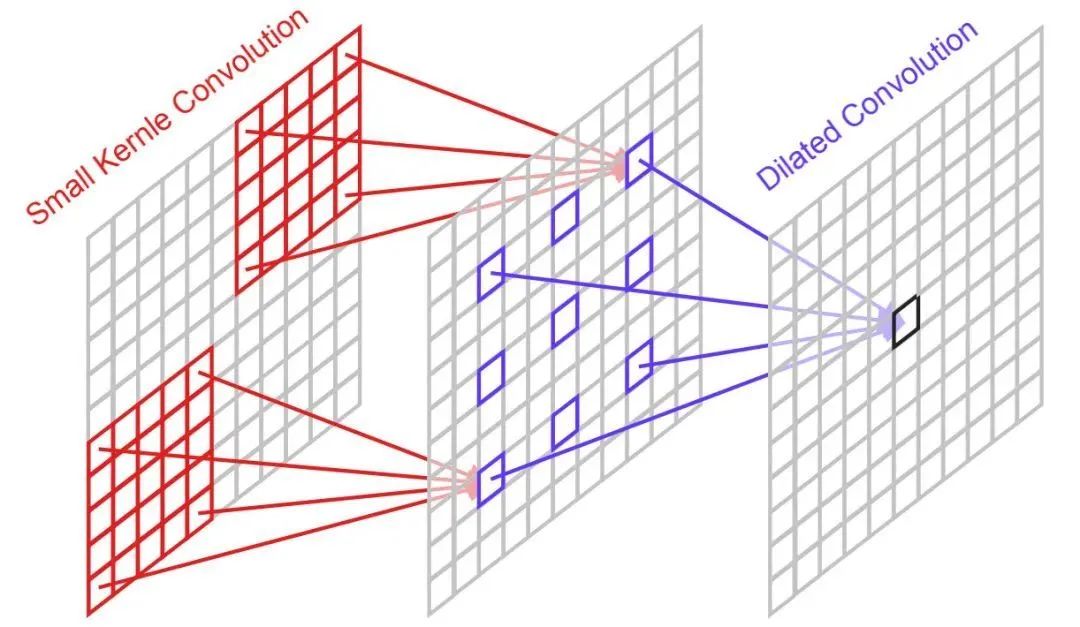 Parameter Reduction 为降低参数量,我们尝试尽可能移除相对不重要的部分。作者提出了三个方案:(1) 将非注意力分支的卷积尺寸从下调到;(2) 将大核卷积注意力分支替换为深度深度分离卷积;(3) 将深度分离卷积中的深度卷积进行分解为深度卷积+带扩张因子的深度卷积(该机制可参考下图,将卷积拆分为+,其中后者的扩张因子为3)。此时,模型性能变为28.48dB,但参数量降到了240K,参数量基本被压缩到了极限。