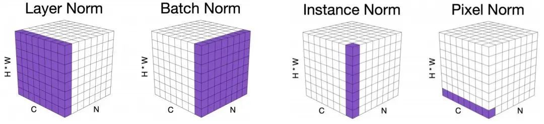 Pixel Normalization(PN) 注意力机制的元素乘操作会导致训练不稳定问题:小学习率收敛不够好,大学习率又会出现梯度异常。前面的注意力改进导致所得方案存在性能下降问题。为解决该问题,作者经深入分析后提出了像素规范化技术(可参考下图不同规范化技术的可视化对比)。