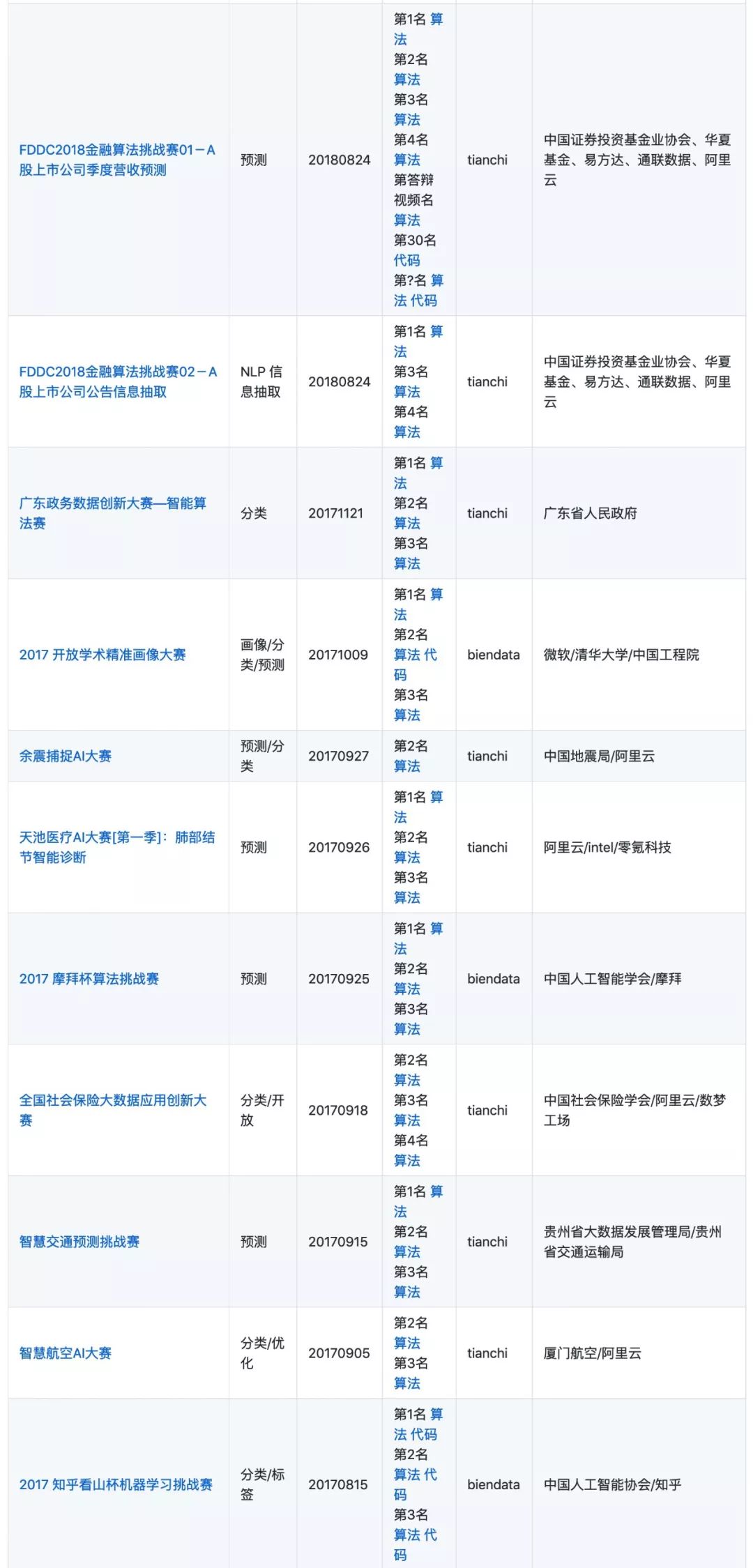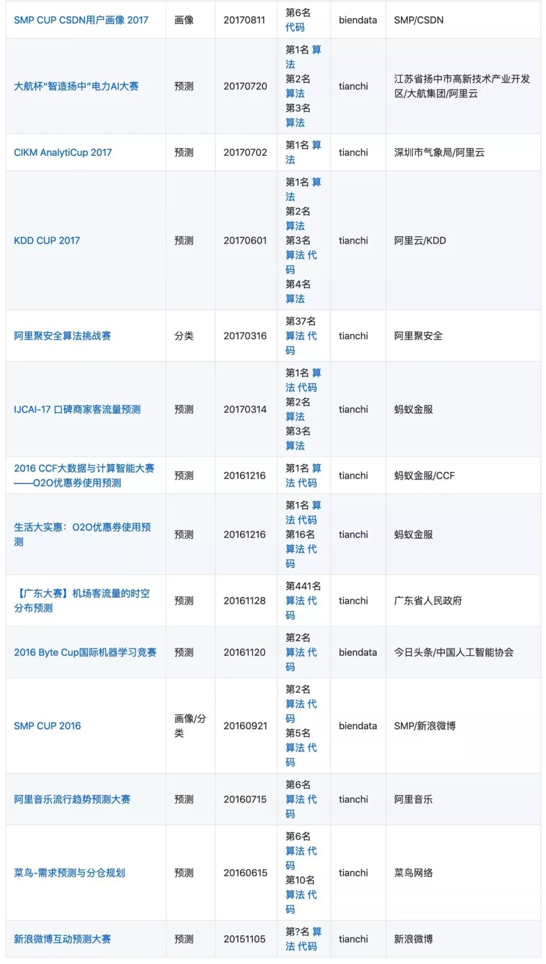 国内各个竞赛平台也在逐步发展,很多国内竞赛的获奖团队会热心地公开自己的算法甚至是源码。Github 上有一个 repo 专注于搜集整理国内算法竞赛的各个优胜解决方案,目前为止已经收集了国内几家较大的数据竞赛平台的 42 场比赛的 104 个解决方案,其中 72 个方案附有开源代码。