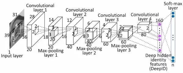 DeepID网络结构是香港中文大学的Sun Yi开发出来用来学习人脸特征的卷积神经网络。每张输入的人脸被表示为160维的向量,学习到的向量经过其他模型进行分类,在人脸验证试验上得到了97.45%的正确率,更进一步的,原作者改进了CNN,又得到了99.15%的正确率。