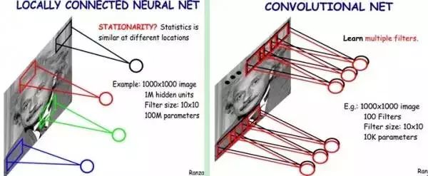 在上右图中,假如每个神经元只和10×10个像素值相连,那么权值数据为1000000×100个参数,减少为原来的千分之一。而那10×10个像素值对应的10×10个参数,其实就相当于卷积操作。