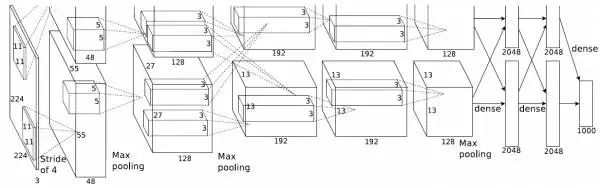 下图即为Alex的CNN结构图。需要注意的是,该模型采用了2-GPU并行结构,即第1、2、4、5卷积层都是将模型参数分为2部分进行训练的。在这里,更进一步,并行结构分为