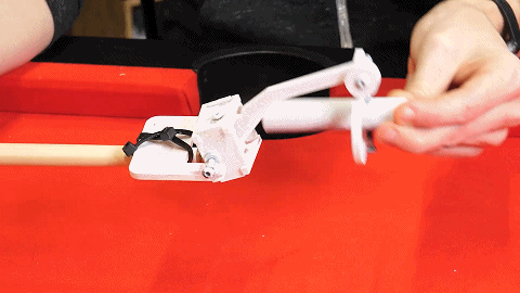 首先来看球杆。这部分的第一个难点在于:如何让球杆的前端自由活动?不只是左右活动,还要上下活动。Wighton 首先想到了一个简单的模型,并造了一个原型出来。但无论怎么看,这个设计似乎都很难稳定控制: