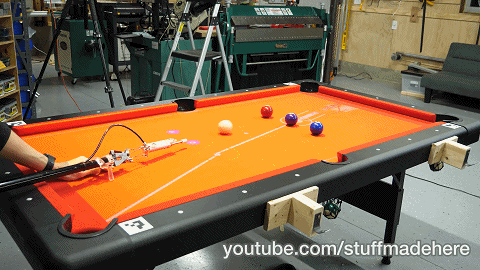 Wighton 所预想的系统是这样的:首先,在球桌的上方安装一个摄像头,用于记录球桌上的基本情况;这个摄像头与一个「大脑」相连,后者可以利用算法,根据摄像头拍摄到的信息计算出最佳击球路线;最后,构建一个末端可以活动的球杆,帮助玩家完成击球动作。