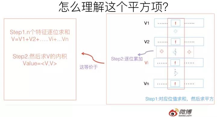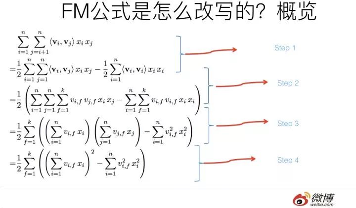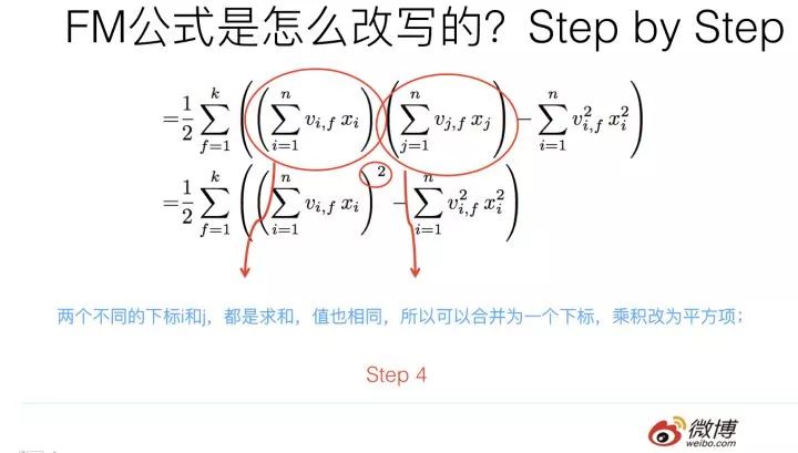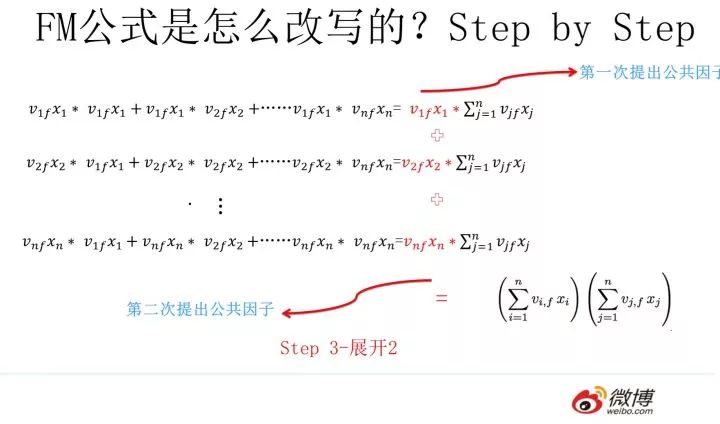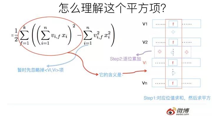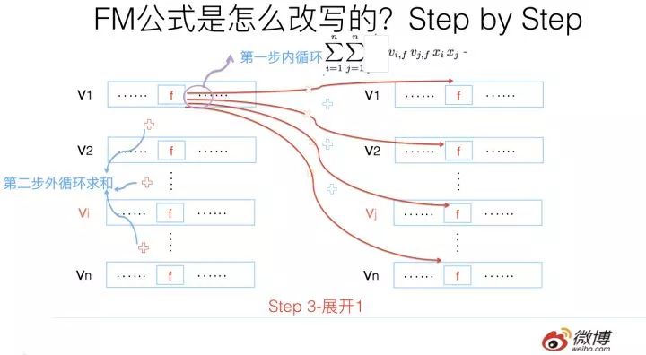 其实吧,如果把k维特征向量内积求和公式抽到最外边后,公式就转成了上图这个公式了(不考虑最外边k维求和过程的情况下)。它有两层循环,内循环其实就是指定某个特征的第f位(这个f是由最外层那个k指定的)后,和其它任意特征对应向量的第f位值相乘求和;而外循环则是遍历每个的第f位做循环求和。这样就完成了指定某个特征位f后的特征组合计算过程。最外层的k维循环则依此轮循第f位,于是就算完了步骤三的特征组合。