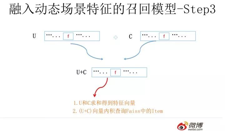 再然后,将U和C向量累加求和,利用(U+C)去Faiss通过内积方式取出Top K物品,这个过程和极简版是一样的,无非查询向量由U换成了(U+C)。通过这种方式取出的物品同时考虑到了用户和物品的特征组合<U,I>,以及上下文和物品的特征组合<C,I>。道理和之前讲的内容是类似的。