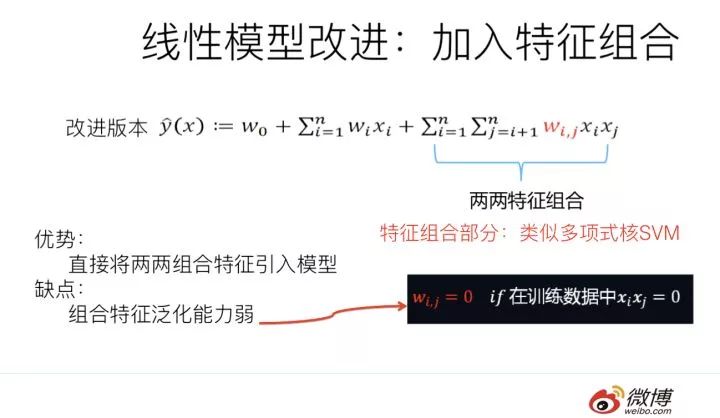 其实想达到这一点并不难,如上图在计算公式里加入二阶特征组合即可,任意两个特征进行组合,可以将这个组合出的特征看作一个新特征,融入线性模型中。而组合特征的权重可以用来表示,和一阶特征权重一样,这个组合特征权重在训练阶段学习获得。其实这种二阶特征组合的使用方式,和多项式核SVM是等价的。虽然这个模型看上去貌似解决了二阶特征组合问题了,但是它有个潜在的问题:它对组合特征建模,泛化能力比较弱,尤其是在大规模稀疏特征存在的场景下,这个毛病尤其突出,比如CTR预估和推荐排序,这些场景的最大特点就是特征的大规模稀疏。所以上述模型并未在工业界广泛采用。那么,有什么办法能够解决这个问题吗?