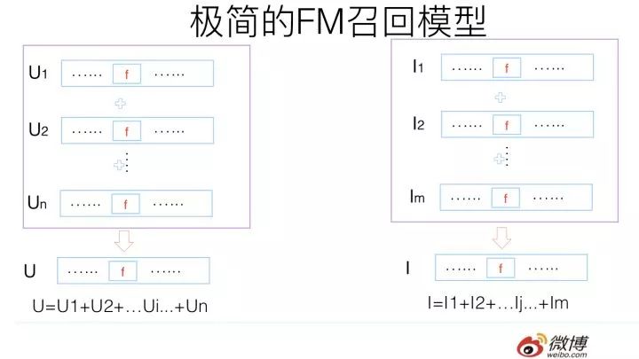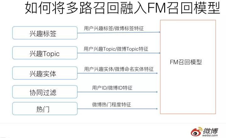 对于比如兴趣分类,兴趣标签,热门,地域等召回策略,要把这些召回渠道统一到FM模型相对直观,只需要在训练FM模型的时候,针对每一路的特性,在用户特征端和物品特征端新增对应特征即可。比如对于地域策略,我们可以把物品所属地域(比如微博所提到的地域)和用户的感兴趣地域都作为特征加入FM模型即可。兴趣标签,Topic,兴趣实体等都是类似的。所以大多数情况下,在多路召回模式下你加入新的一路召回,在FM统一召回策略下,对应地转化成了新增特征的方式。