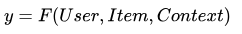 意思是,我们利用用户(User)相关的特征,物品(Item)相关的特征,以及上下文特征(Context,比如何时何地用的什么牌子手机登陆等等)学习一个映射函数F。学好这个函数后,当以后新碰到一个Item,我们把用户特征,物品特征以及用户碰到这个物品时的上下文特征输入F函数,F函数会告诉我们用户是否对这个物品感兴趣。如果他感兴趣,就可以把这个Item作为推荐结果推送给用户。