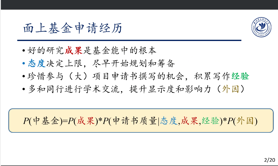 (1)面上基金申请经历。态度决定上限,尽早开始筹备;要多参与一些大项目申报,积累写作经验;多与同行进行学术交流。